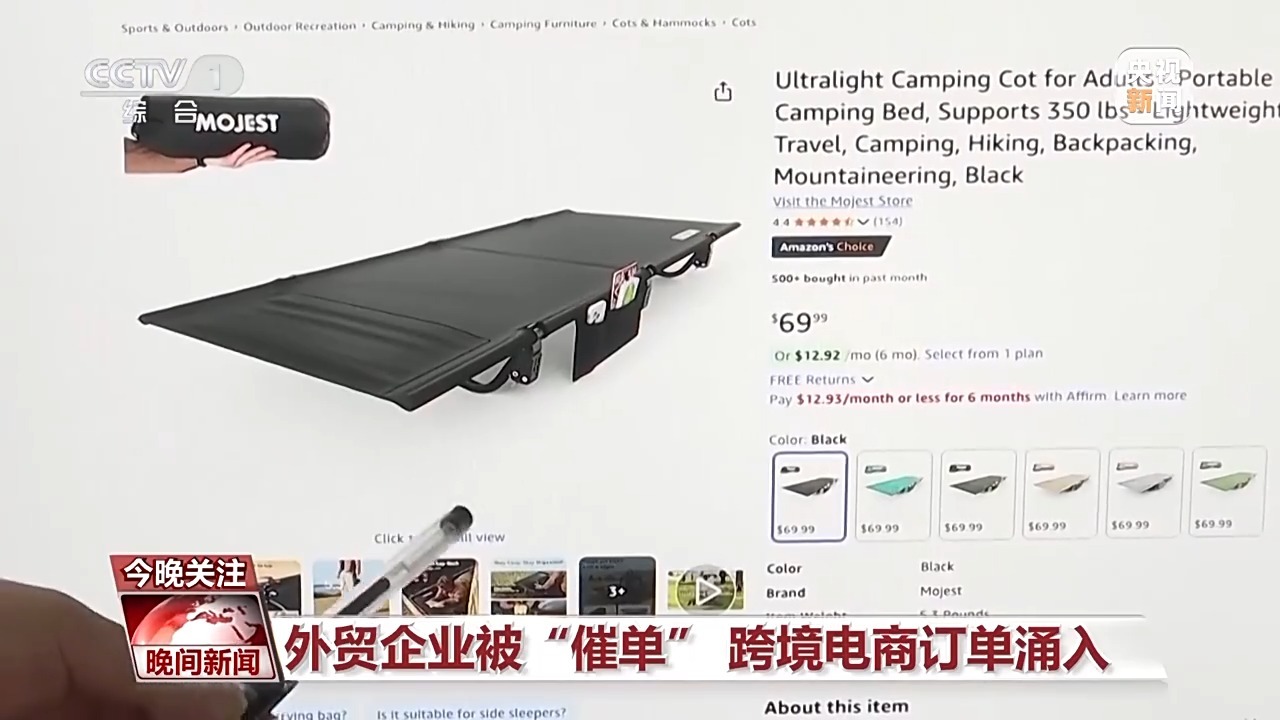 在这家跨境电商企业记者发现,一款户外躺椅的平台售价从109.99美元被调回了之前的69.99美元,在关税问题出现之前,这款躺椅每天单一平台就能卖出三四千台,美国加征关税后,由于产品价格上调销量曾急速下滑,这两天,美国客户开始大量补货。