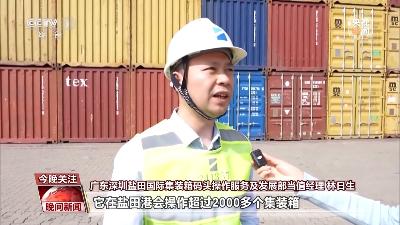 盐田国际集装箱码头操作服务及发展部当值经理 林日生:这是去往美国的一艘船,它在盐田港会操作超过2000多个集装箱。其他船公司全部都在协调码头来调靠泊位,码头每天都有6班船舶去往美国。